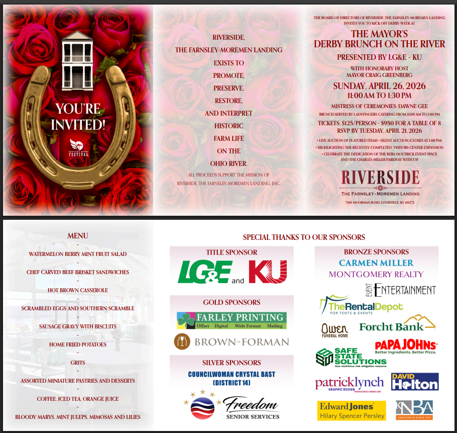 Kick off your Derby Week Celebrations at Riverside’s annual Mayor’s Derby Brunch On the River on Sunday, April 26, 2026 from 11 AM to 1:30 PM! This fun, festive event features an authentic Kentucky breakfast (catered by Ladyfingers), live music, a brief live auction, a silent auction, door prize drawing, and tours of the historic Farnsley-Moremen House. This is an Official Kentucky Derby Festival event with Honorary Host Mayor Greenberg and Mistress of Ceremonies Dawne Gee (WAVE-3). All proceeds from this fundraiser support the educational mission of Riverside, the Farnsley-Moremen Landing. Join us for a good time in a beautiful setting–and support a community treasure at the same time! All tickets and tables must be purchased by April 21, 2026.