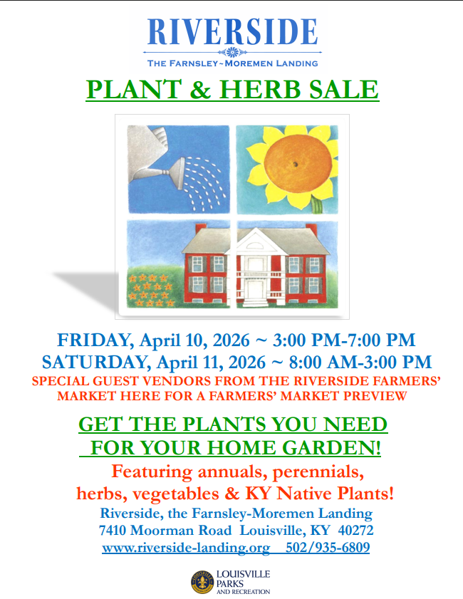 Please join us for our Annual Plant & Herb Sale to get the plants you need for your home garden, featuring annuals, perennials, herbs, and Kentucky Native Plants. Special guest vendors from the Riverside Farmers’ Market will be there, too. The Plant & Herb Sale on Saturday, April 11, 2026 from 8:00 AM – 3:00 PM. All proceeds support Riverside’s historic gardening efforts.